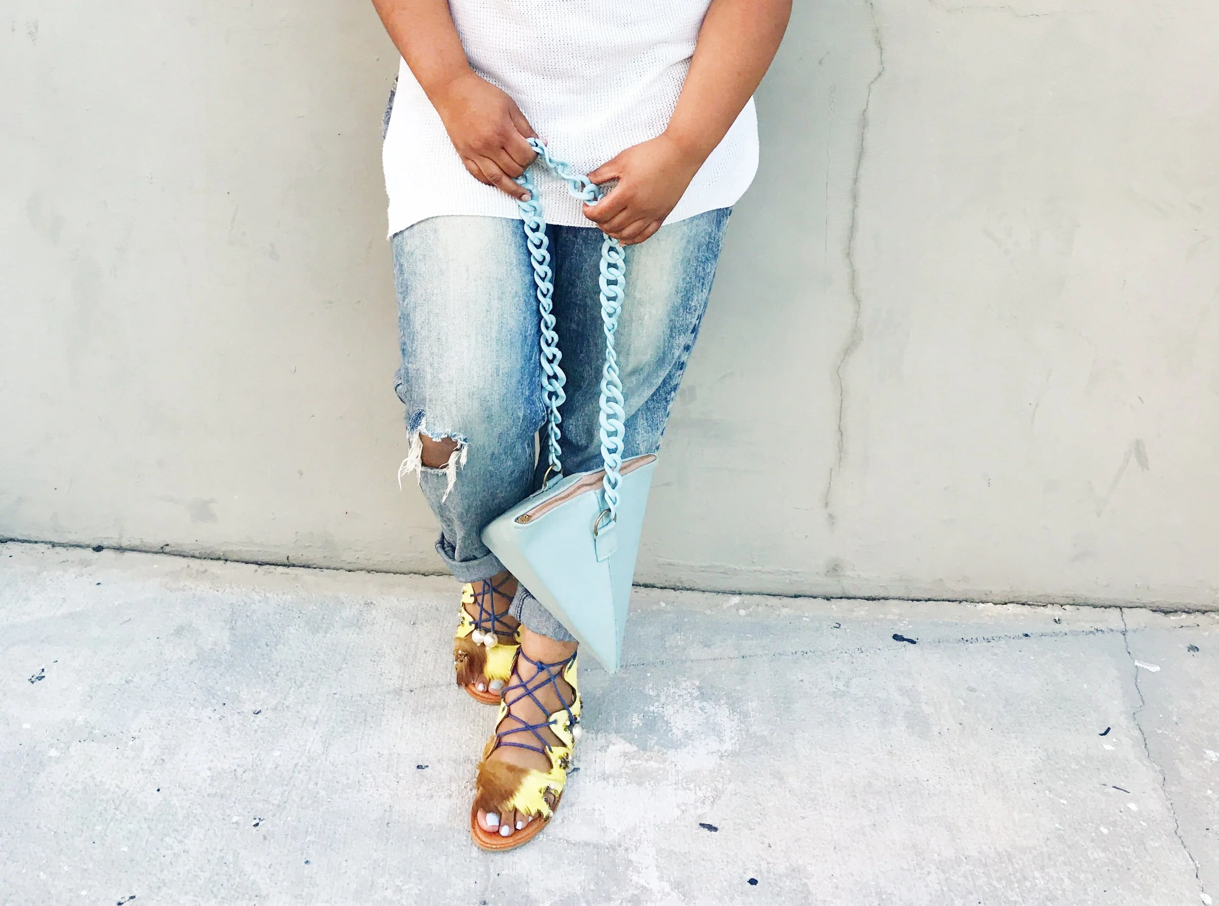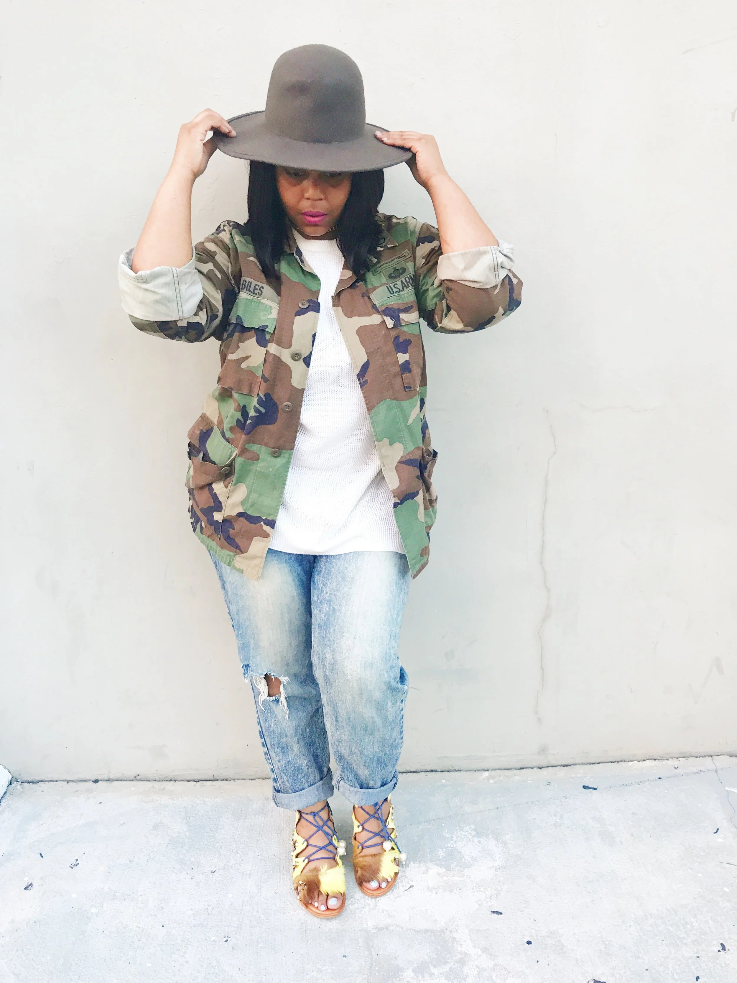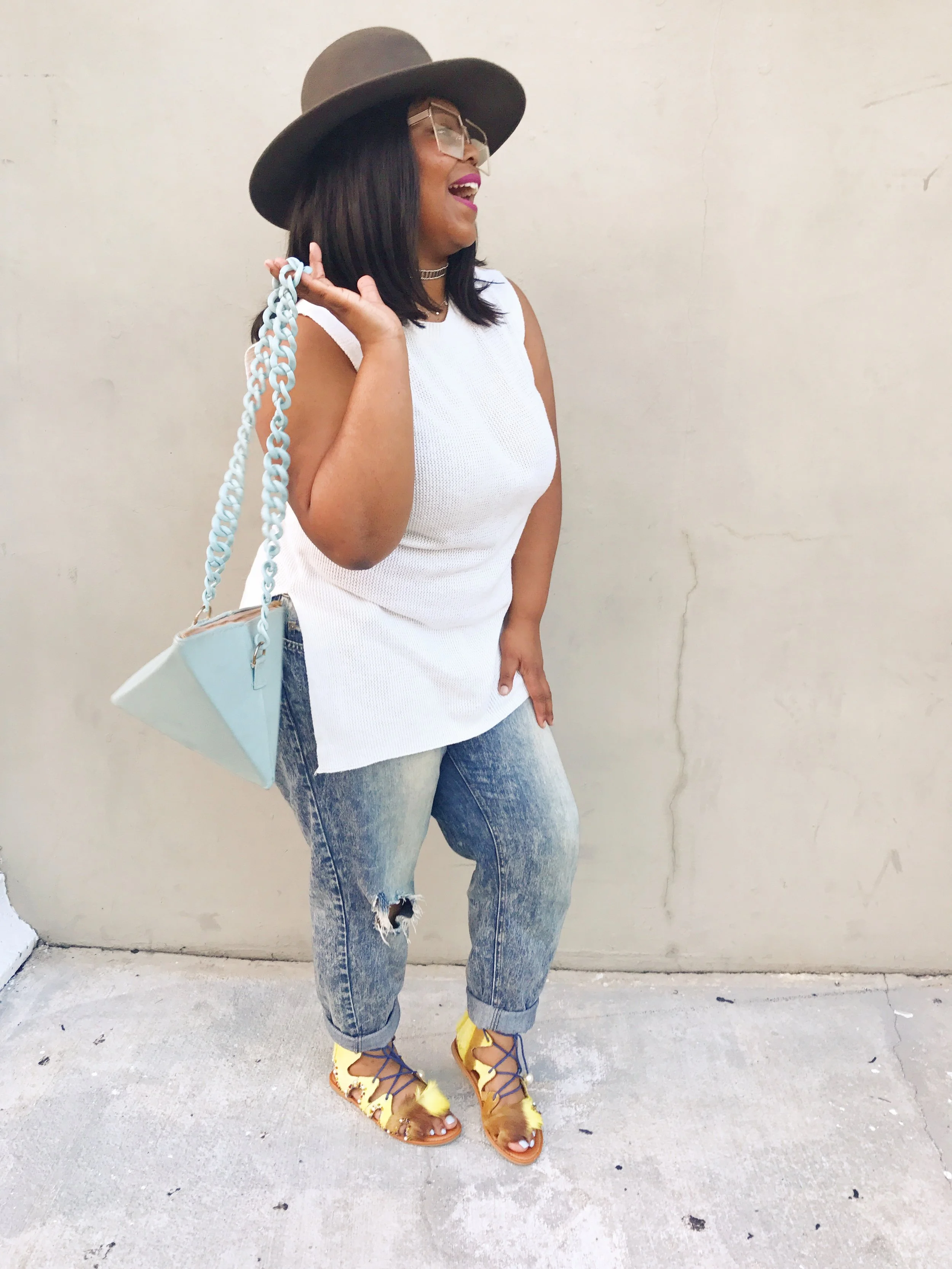Let's also talk about my sandals which was also designed by MonSaintFleur. So I purchased some gladiator sandals that were all white and I wasn't really feeling them. So I decided to contact MonSaintFleur to see if she could help a sister out and give me something new. That is exactly what she did. These are my favorite statement sandals thus far. I decided to pair this up with a simple creme top, boyfriend jeans, a choker and a hat to seal the deal. This look is simple yet still fashionable.
